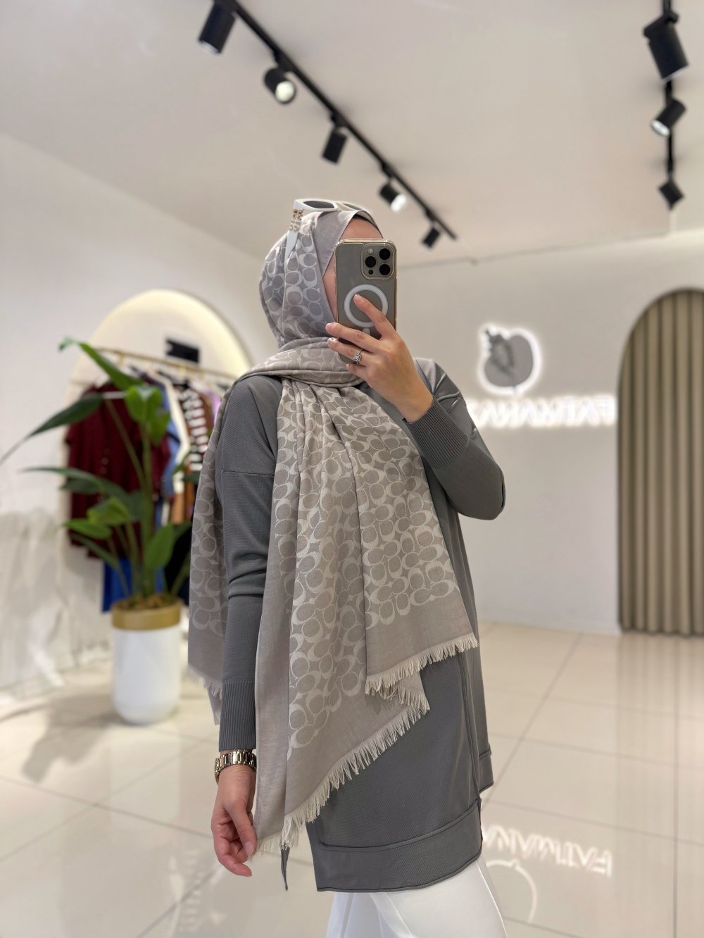 C Desen Yün İpek Şal Açık Gri Beyaz