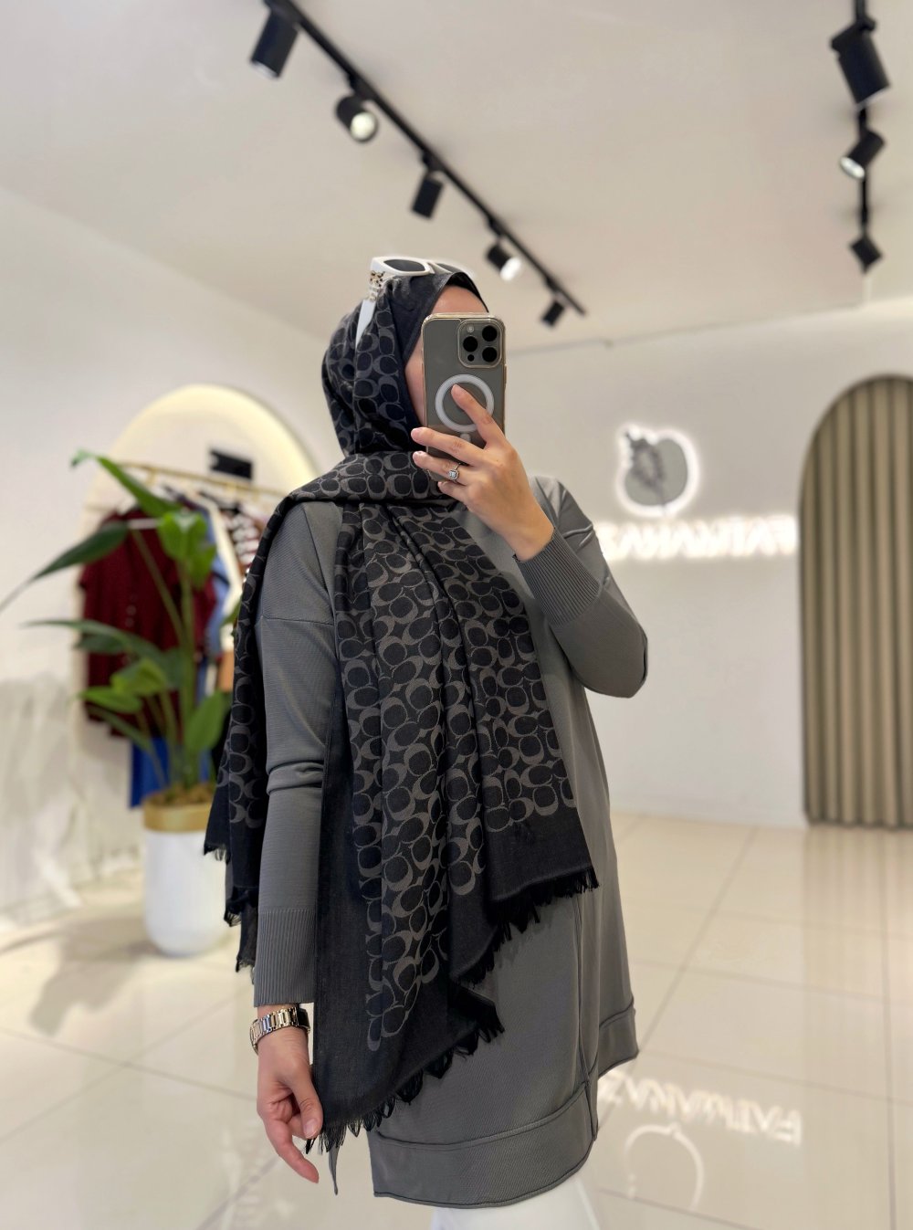 C Desen Yün İpek Şal Siyah Gri